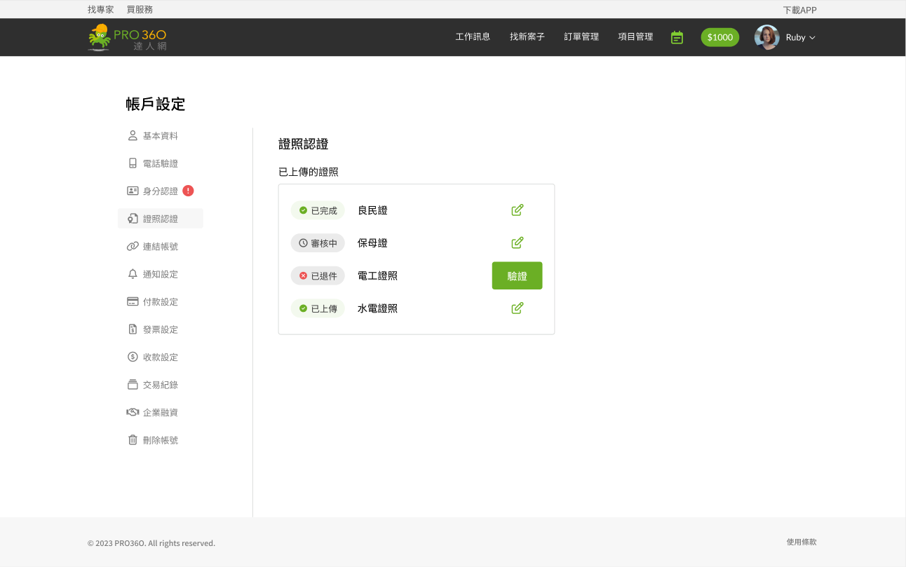 完成上述步驟後即可於頁面看到您剛剛上傳的證照資料,PRO360將會儘速審查您提交的證照,請您耐心等候,您也可以隨時回到本頁追蹤審查狀態。